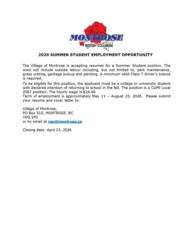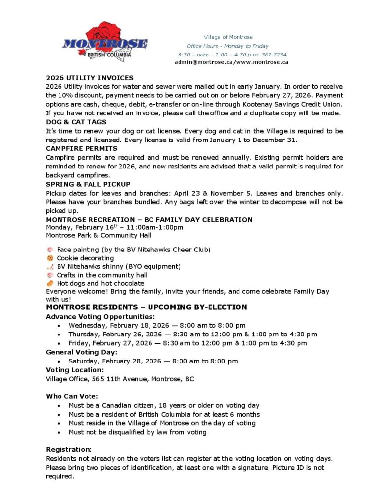 The Village of Montrose will be holding a by-election for the purposes of electing one Councillor. The term of appointment will run until the general election in 2026.